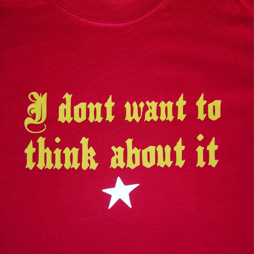 Hand printed, made with love! Shirt features the words "I dont want to think about it" featuring a Reflective Vinyl star! Look how it shines!