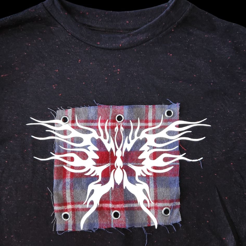 Features Butterfly pressed in Reflective vinyl on top of plaid patch attatched with metal grommets.