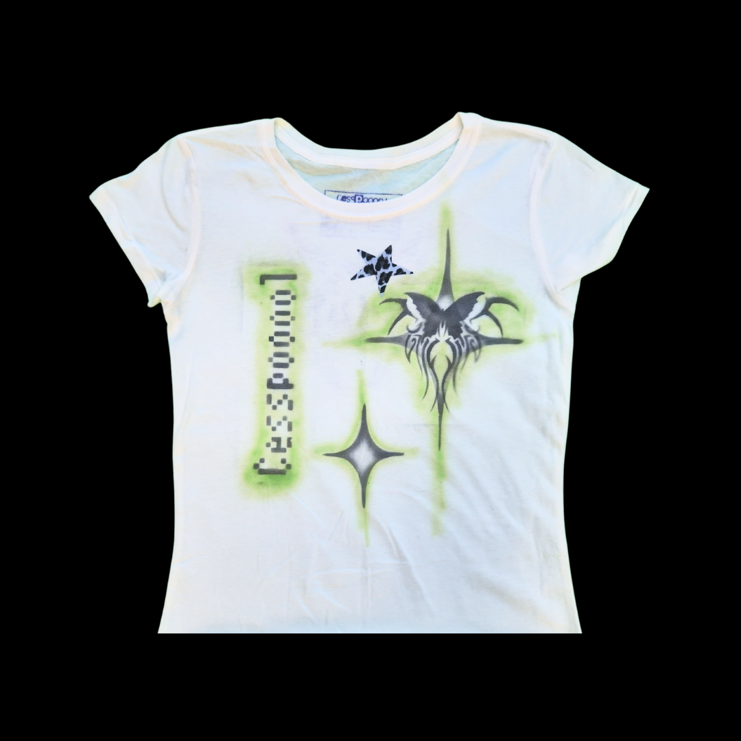 Hand Airbrushed stretchy cream colored tee in size medium. Choose from Pink, Blue, or Green! Front says "Cesspooool" with an Airbrushed butterfly and sparkles. The back features an aura butterfly.