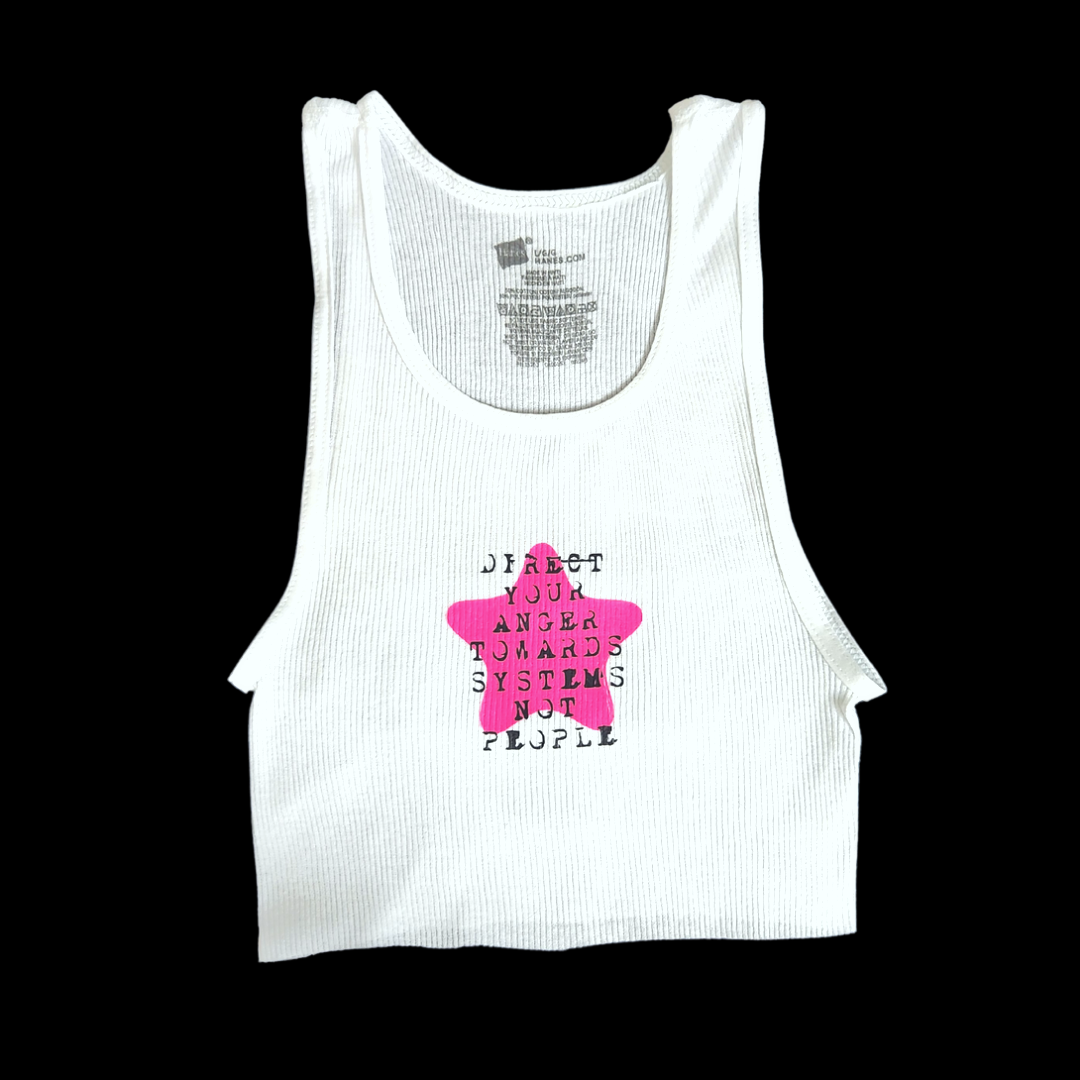 Shirt features "direct your anger towards systems not people" in vinyl on front.