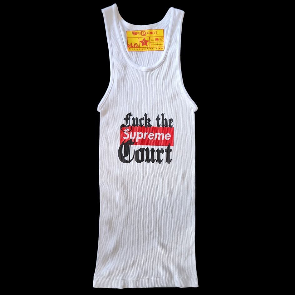Shirt features "FUCK THE SUPREME COURT" on front of ribbed tank.