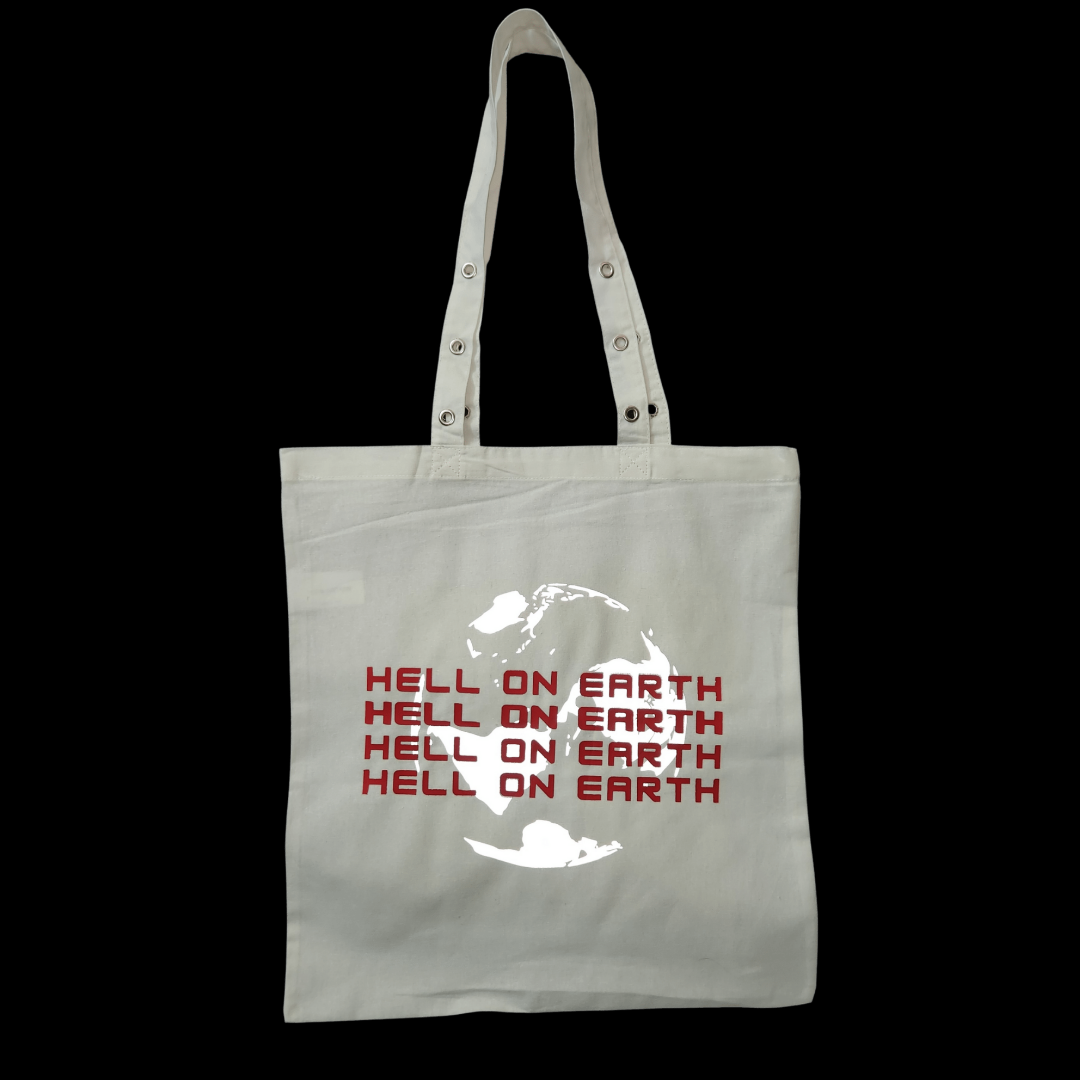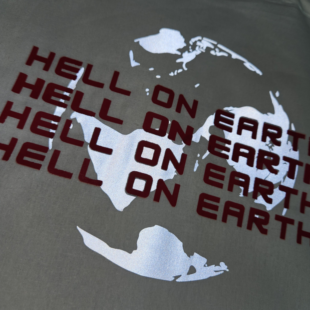 Features the words "Hell on Earth" in vinyl. Also features Grommets and is reflective in all lights! (World is reflective vinyl!)