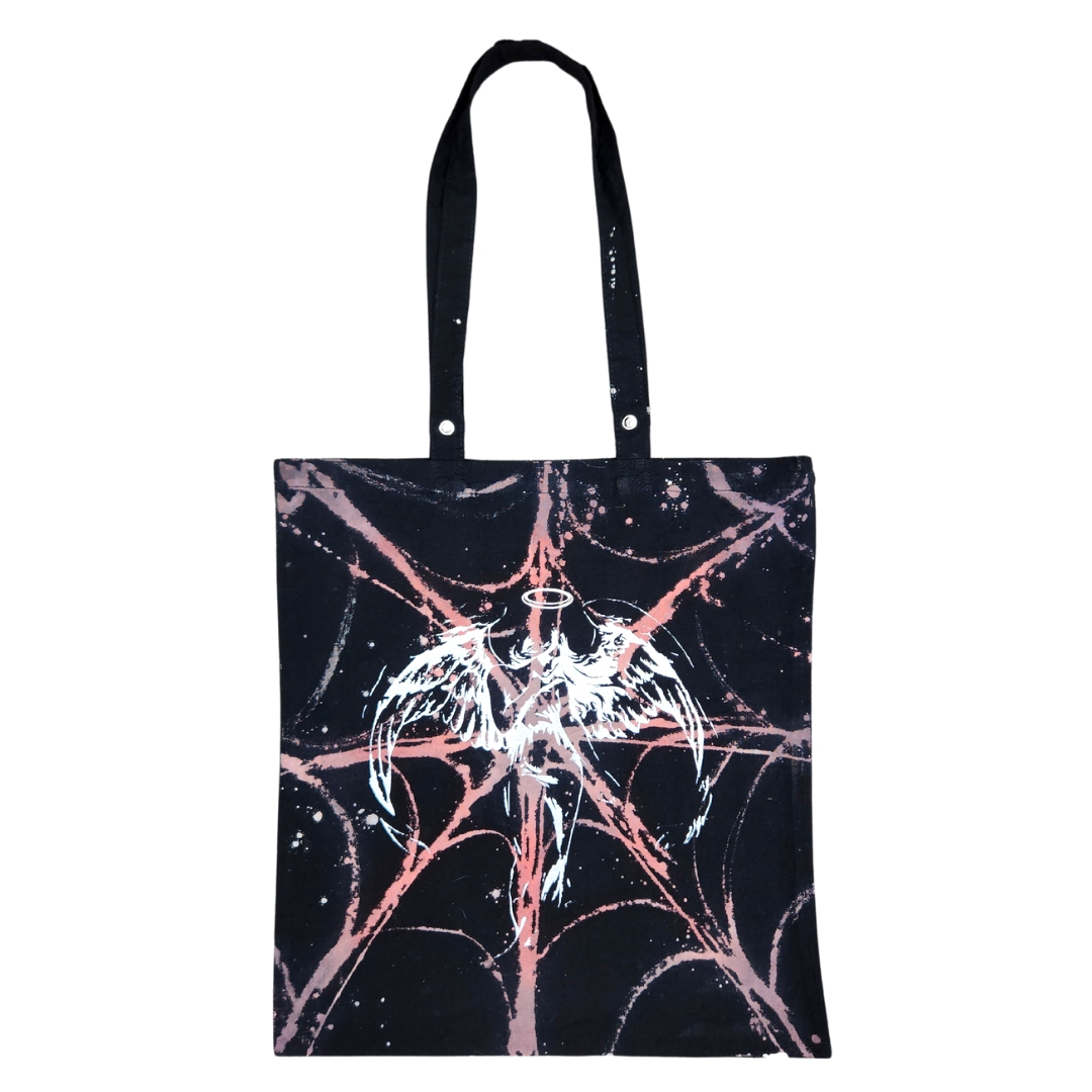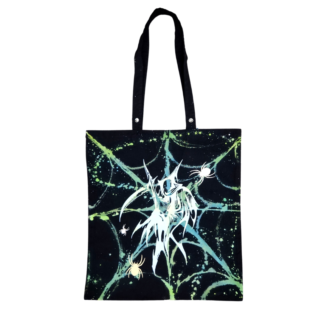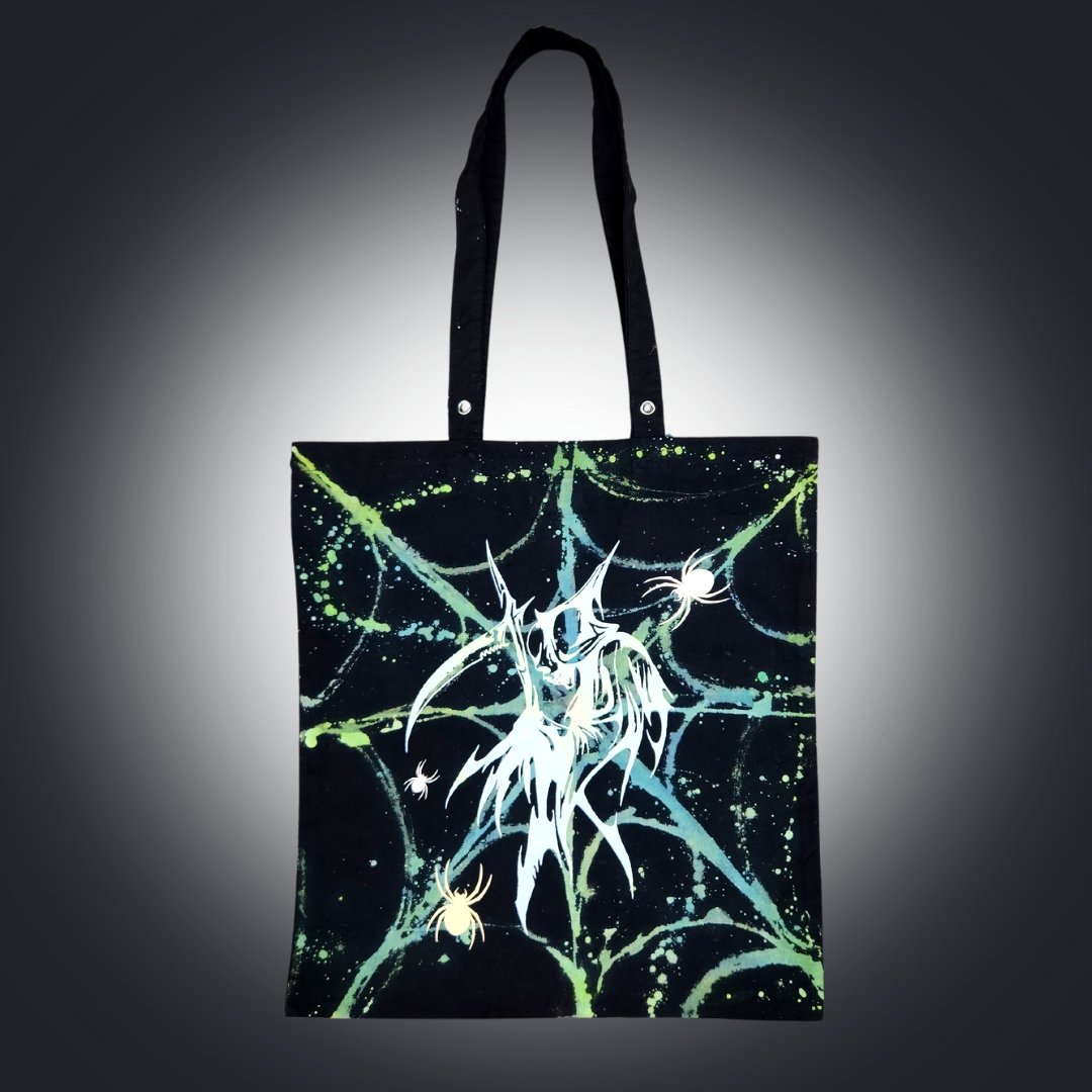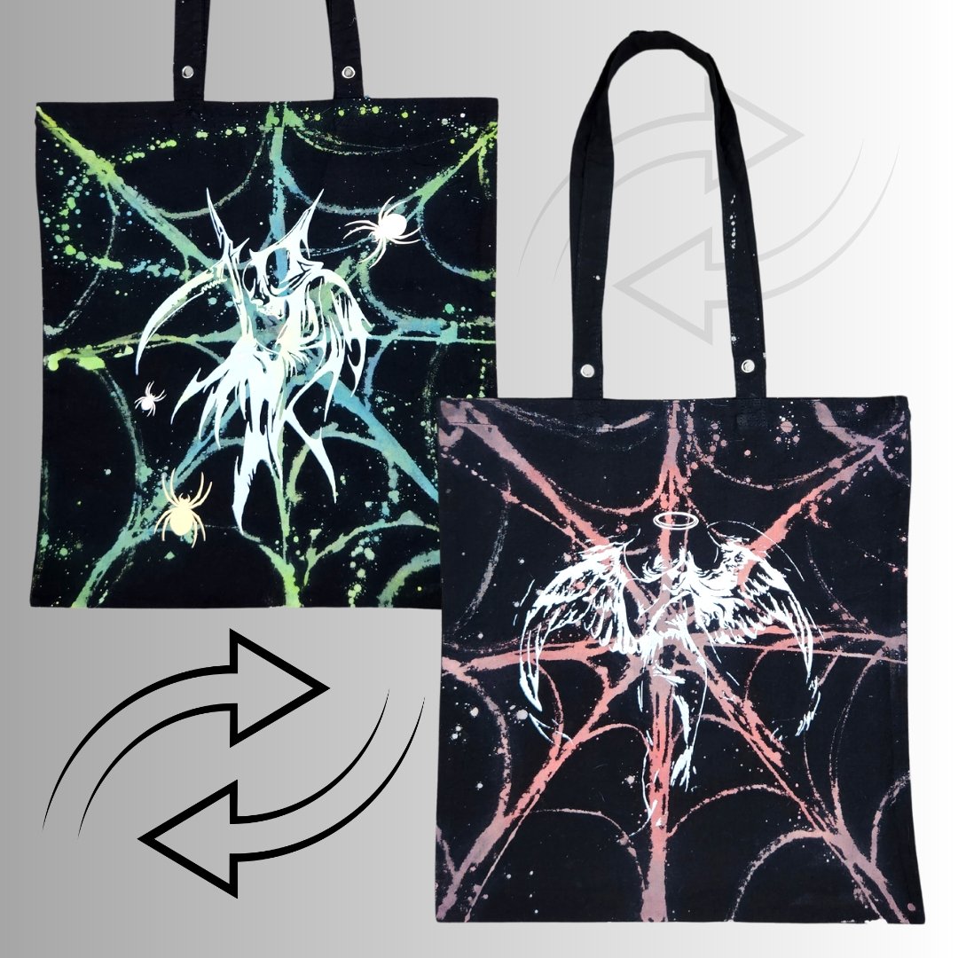 Features Reaper in white vinyl featuring Reflective vinyl spiders on one side. The other side is shaded pink/purple and features a metallic Angel with a Reflective Halo! Also features Grommets on handle !